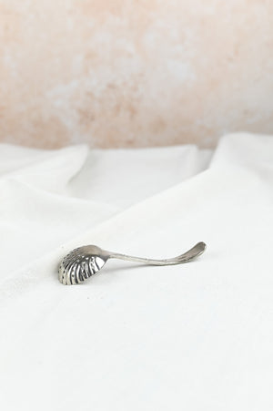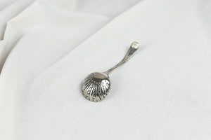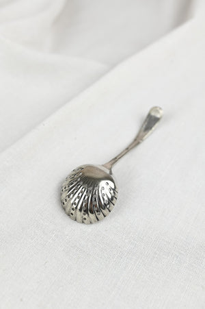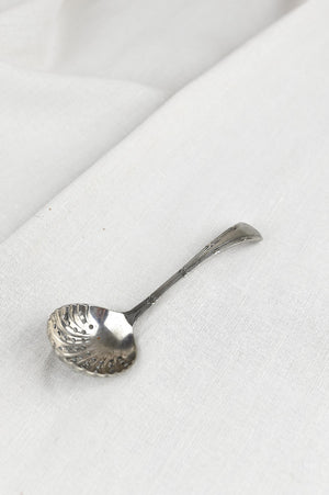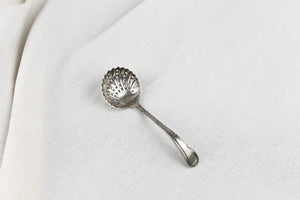 Presenting a charming Edwardian silver-plated sugar sifting spoon, dating back to the late 1800s. Vintage Edwardian era silverplated sugar sifting spoon. Shell design patterned bowl. This traditionally designed spoon features perforations in the shell-pattern bowl and an intricately adorned handle with space for an engraved ornament at the top. It maintains its charm despite some fine scuffing on the surfaces and a subtle brassy tone in the bowl, revealing its history and the passage of time through generations of use. In good condition, this spoon is a delightful relic with a unique story to tell.