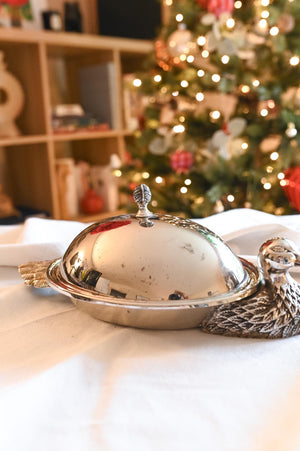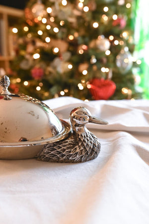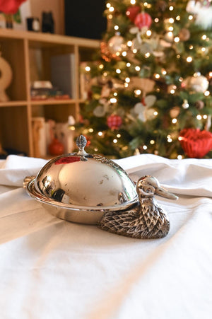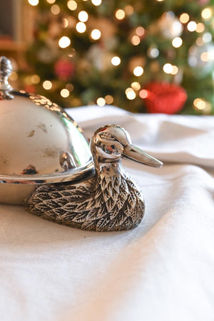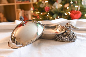 This antique silverplate dish is a treasure for collectors. Its charming duck-shaped design brings a playful elegance to any table setting. Crafted from durable silverplate, it combines sturdiness with timeless beauty. The dish includes a glass plate, making serving and cleanup a breeze. Perfect for entertainers and vintage décor enthusiasts alike.