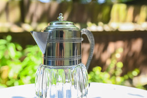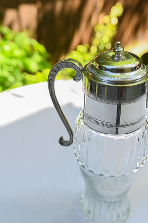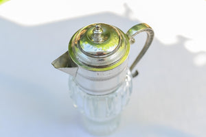 Presenting an exquisite Art Nouveau French glass wine jug or decanter, featuring a distinctive etain (pewter) handle and top. Estimated to be crafted in the 1920s-1930s, this elegant piece would enhance the aesthetic of your table, drinks trolley, or home bar.