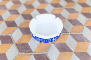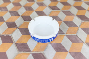 Vintage French Ashtray for Anisette 51, crafted in charming white and blue Opaline glass. This versatile piece can serve as an ashtray or a small dish, adding a touch of elegance to any setting.