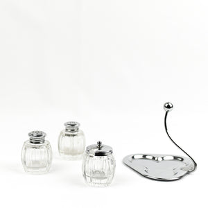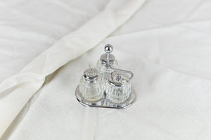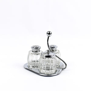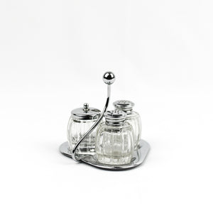 Presenting an exquisite triptych featuring salt, pepper, and mustard condiments, elegantly showcased on a stainless steel tray. The thoughtful design includes a small handle for easy handling and a secure grip. The jars, crafted from molded glass, add a touch of sophistication to your table setting. In very good condition, this set carries an air of timeless charm. Please note that the mustard spoon is missing, but this charming ensemble still remains a delightful addition to your dining experience.