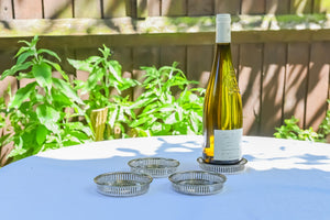 Enhance your table setting with these elegant vintage stainless steel bottle coasters. This set of four French coasters, meticulously crafted in France, combines timeless sophistication with practical functionality. Each coaster is designed to protect your surfaces while adding a touch of classic charm to your dining experience. Perfect for both everyday use and special occasions, these coasters are a testament to fine French craftsmanship.