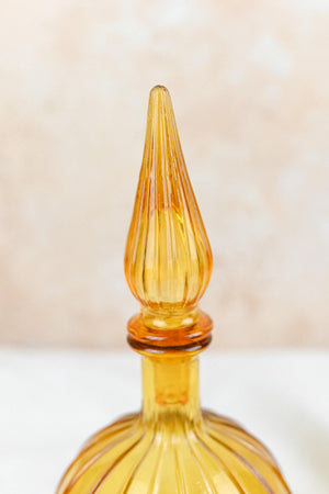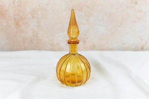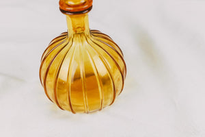 This stunning vintage Empoli glass decanter, often referred to as a "Genie Bottle," showcases the timeless elegance of Italian craftsmanship. Made in Italy, this piece features a rich amber hue with a striking silhouette, making it a beautiful collectible for any glassware enthusiast. Its unique design and vibrant color are perfect for adding a touch of vintage charm to your home decor or bar collection.