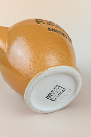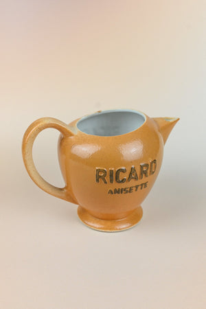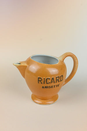 Originating from France circa 1950, this water jug advertises Ricard Anisette, a popular anise-flavoured aperitif. Traditionally, such drinks are served with water to dilute their potency, making this jug a cultural emblem. Crafted to boost sales, it features a sleek squared-off design, departing from the traditional globe shape. In excellent condition, it bears the mark "Ateliers de Céramique Ricard/Made in France" on its base.