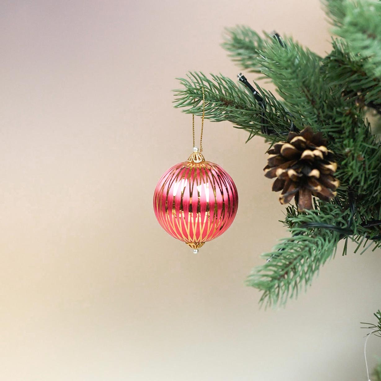 This vintage 1970s Christmas bauble made of pink silk thread and adorned with intricate gold thread details. A timeless piece that adds a touch of nostalgia and opulence to your holiday decor.