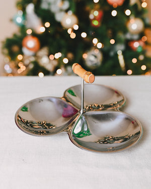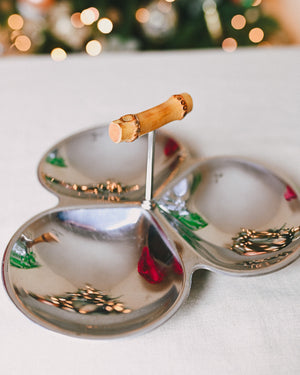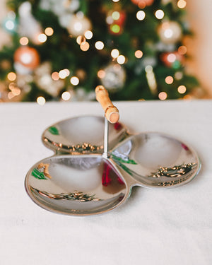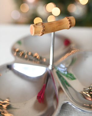 Stylish seventies-inspired tray and aperitif platter, ideal for serving nuts, olives, and more. Features a bamboo handle and three spacious trays.