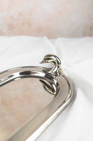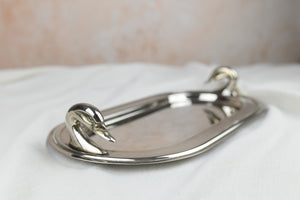 Silver-plated foie gras platter with goose head handles, French vintage tableware. In good vintage condition from the 80s, with some faint traces on the metal, but they are discreet overall.