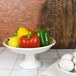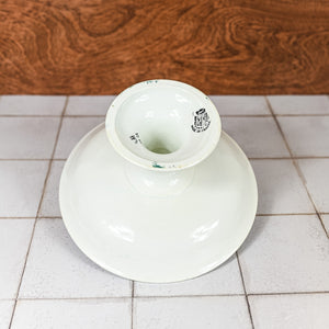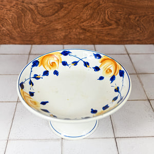 Experience the charm of this French compote dish or cake pedestal stand. Adorned with a pattern of orange and blue roses on the interior of the bowl, it boasts an elegant blue line along the pedestal. The authenticity is underscored by a French maker’s mark on the base, proudly signed “St. Amand.” This exquisite piece is a testament to its origin, crafted with care and grace in France.
