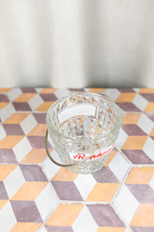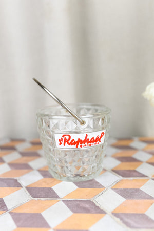 This charming French glass ice bucket, adorned with decorative elements, was distributed to bars, cafés, and bistros across France in the 1950s as part of a promotional campaign by St. Raphaël. The renowned makers of 'Aperitif Rouge,' a flavorful aperitif wine, aimed to capture the attention of patrons with this stylish and practical item.