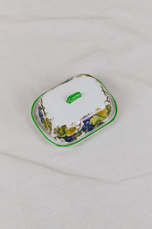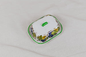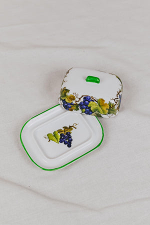 This charming vintage butter dish features a hand-painted grapevine design with rich purple grapes and lush green leaves, adding a touch of rustic elegance to any table setting. The dish is made of fine ceramic with delicate green trim and a matching green handle on the lid. Perfect for serving butter or as a decorative piece, it brings a warm, countryside aesthetic to your kitchen. Ideal for collectors or anyone who appreciates timeless, vintage tableware.
