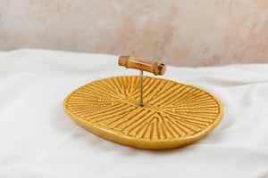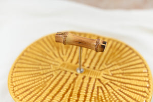 Step into the past with this enchanting vintage French Majolica cheese tray. Its intricate woven design and bamboo handle exude rustic charm, likely originating from the 1950s or 1960s. Whether you're hosting a soirée or seeking to enhance your décor, this timeless piece adds a touch of elegance and history to any setting.