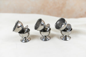 A set of 6 vintage egg cups made from durable stainless steel, perfect for any retro-inspired kitchen. These classic pieces were crafted in France and offer a timeless design that suits both traditional and contemporary table settings. With a robust construction, these egg cups are designed to last, and their vintage charm adds a touch of elegance to any breakfast or brunch.