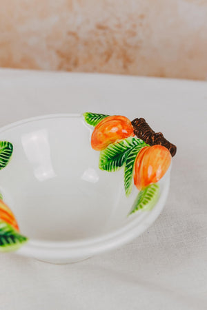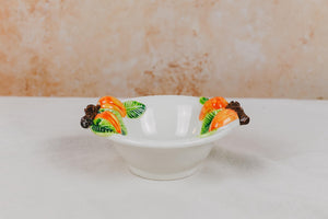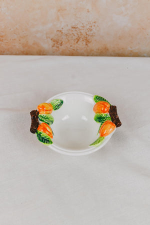 This exquisite Italian Majolica bowl is a stunning example of traditional craftsmanship. Featuring a hand-painted peach motif with vibrant green leaves and rustic branch-style handles, this piece embodies Mediterranean charm. The glossy white ceramic base beautifully highlights the intricate details and warm orange hues of the fruit.