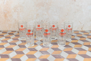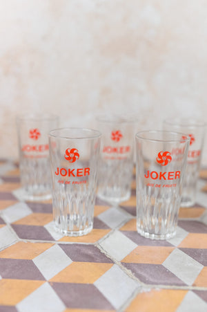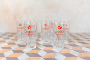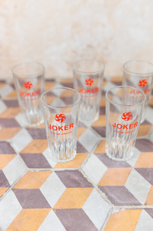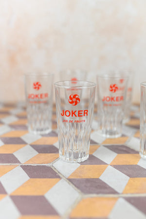 This collection features seven vintage bistro advertising glasses showcasing the Joker brand from the 1970s and 1980s. Crafted in France, these versatile glasses are perfect for serving beverages such as juice or water in a charming bistro style.