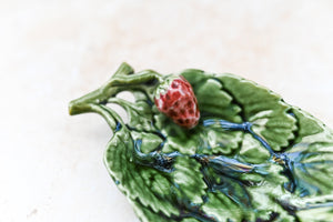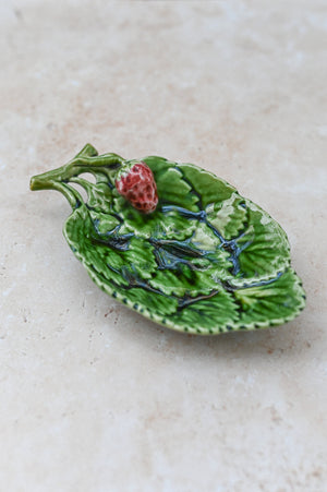 Admire the elegance of this exquisite antique Majolica dish, adorned with vibrant colors and charming strawberry leaf motifs. Crafted from green Majolica pottery, it serves as a delightful candy dish featuring intricate leaf patterns and delightful strawberry decorations.
