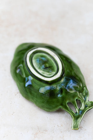 Although no maker's marks are visible, its beauty remains timeless. Revel in the allure of vintage Secla Portugal craftsmanship embodied in this charming green grape leaf plate. Perfect for serving as a catchall trinket dish, it adds a touch of nostalgia to any space with its hand-painted ceramic glaze. Evoking a sense of Cottagecore charm, this piece boasts a captivating deep green hue and an abstract shape that exudes uniqueness. Its textured pattern adds depth and character, making it a truly remarkable addition to your decor collection.
