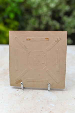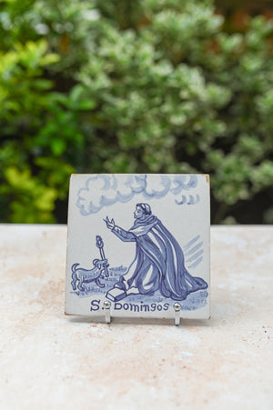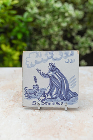 This vintage tile mural features one meticulously hand-painted azulejo using the traditional majolica technique. Depicting San Domingos with a loyal dog, it showcases exquisite craftsmanship. While it bears signs of age, revealing its rich history, please refer to the accompanying video for a closer look at its charming patina.